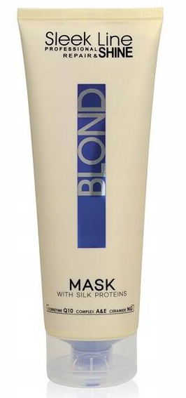 Maska Sleek Line Blond z jedwabiem. Maska z jedwabiem do włosów blond siwych i rozjaśnianych specjalna formuła zapewnia włosom platynowy odcień. Zawarte proteiny jedwabiu doskonale regenerują zniszczoną strukturę włosa. Delikatnie pielęgnuje eliminując żółty odcień włosa.
